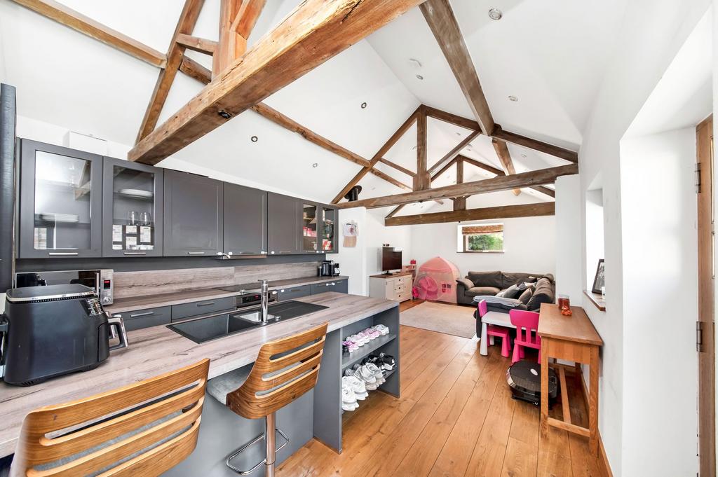 Timber and glazed door leads through to the living room. This, with kitchen area, is a fabulous space. There is a high angled and beamed ceiling, wonderful amount of inset spotlighting, wood burning stove, beautiful, polished timber floor and a variety of windows giving a good amount of natural light and views out towards the main house and the courtyard. There are two stylish central heating radiators and provisions for a wall mounted TV.