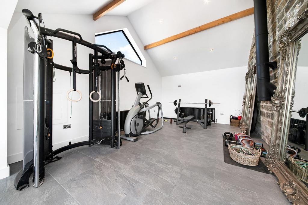 This fabulous garden room enjoys a full bank of glazing with full slide back doors, four Velux windows and a fabulous gable window. With a continuation of the ceramic tiled flooring, there is exposed stone work, inset spotlighting to the ceiling and period style central heating radiator. The garden room opens through to the gym.