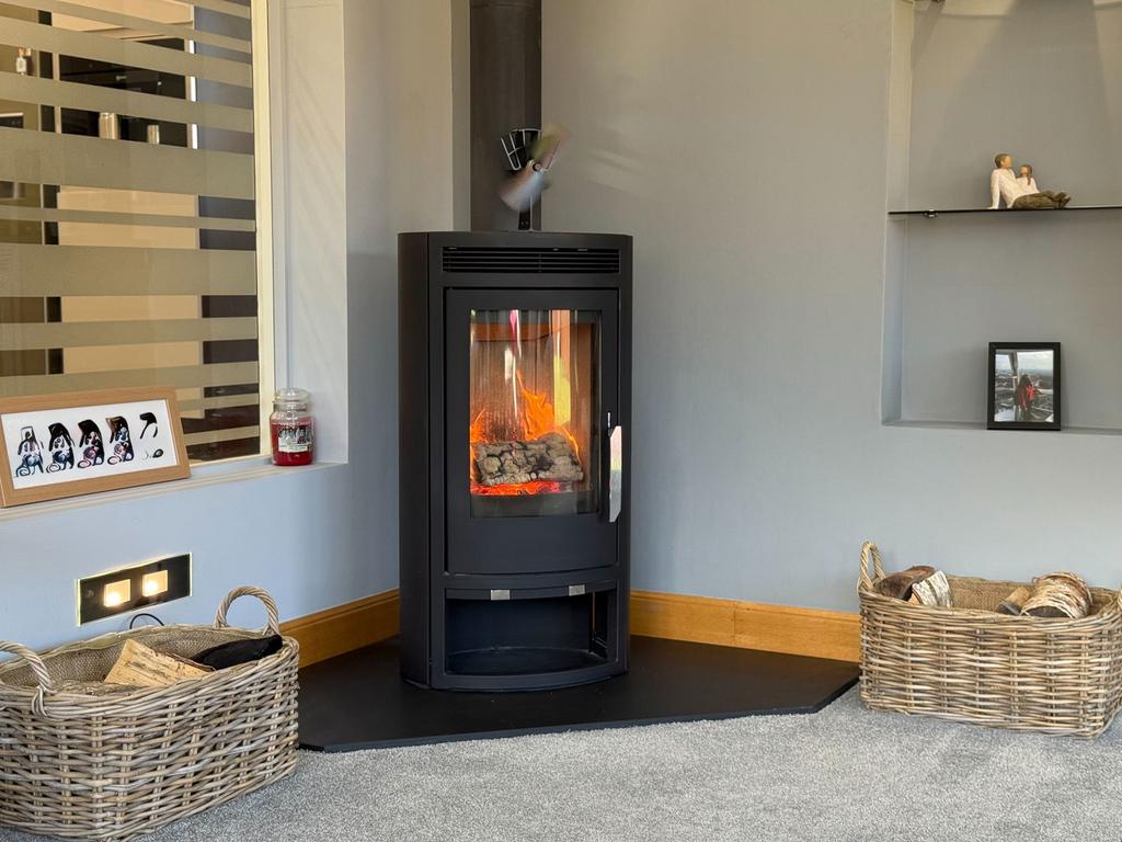 LOUNGE (5.59 m x 5.85 m):- Solid oak carpeted steps descend from the kitchen to the extremely bright and spacious lounge. Large feature windows look from the lounge through to the kitchen and are a pleasing feature within this beautifully proportioned room. Floor to ceiling windows with electric blinds to the rear aspect together with floor to ceiling windows and French doors again with electric blinds to the side elevation offer a generous amount of natural light. This room comprises a media wall with shelving either side, integrated lighting and surround sound speakers are built into the 9 foot ceiling with in-built mood lighting. A woodburning stove rests on a slate hearth and acts as a pleasing focal point within the lounge which benefits from all oak finishings and provides access to the rear garden.