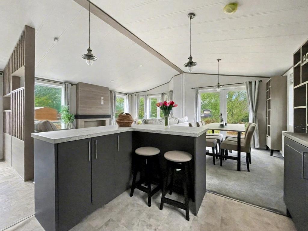 One of the features of this lodge is this spacious and open plan living/dining area, with vaulted ceilings and inset spotlights. The room has fitted carpet and a brise soleil creating a modern and cosy feel. The reception is filled with natural light and a window seat for enjoying the outside views. There is a media wall which features an electric stove-style fireplace and large double glazed windows. As the lodge is furnished, you can walk right in and start enjoying the lodge lifestyle. The dining room offers a table with six chairs and a low hanging modern light fitting. Dual aspect views with a double glazed window to the side aspect and double French doors which could lead onto a raised balcony area if desired. Two fitted units are included for décor or storage. Radiator.