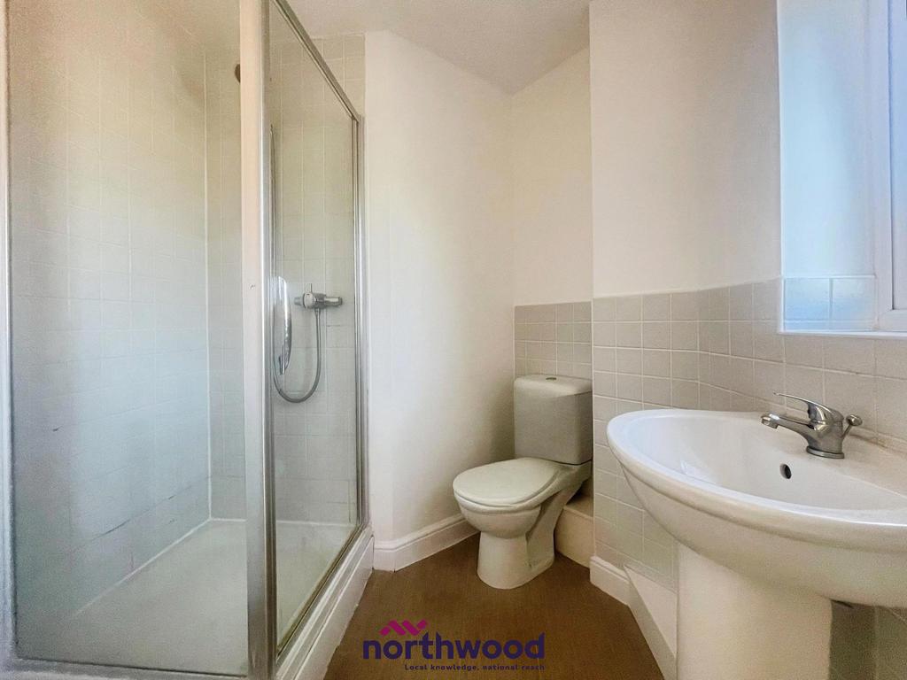 With 2 piece white suite comprising close coupled toilet and wash hand basin with stainless steel taps over incorporated into fitted furniture. Walk in shower cubicle, fully tiled with mixer shower over. Wood effect vinyl to flooring, radiator and double glazed window to rear aspect.