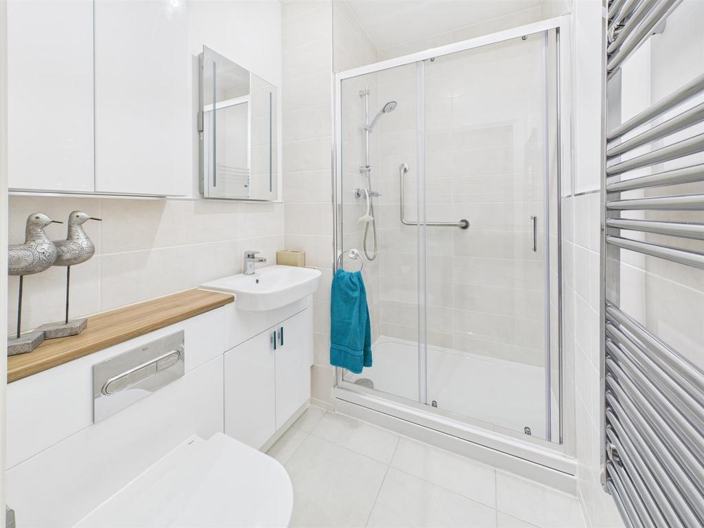 Bathroom - Suite comprising low level wc, double step in cubicle with shower over, wall mounted wash hand basin with mixer tap over and storage below, wall mounted vanity units, wall mounted heated towel rail, partly tiled walls, tiled flooring.
