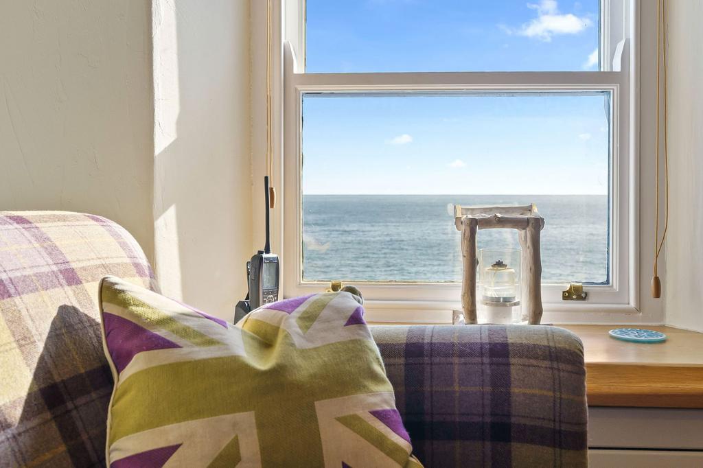 Stairs rise to the first floor, where a cosy living room takes in sea views through the window. Original features add character, with exposed beams overhead and a charming inglenook fireplace creating a focal point.
