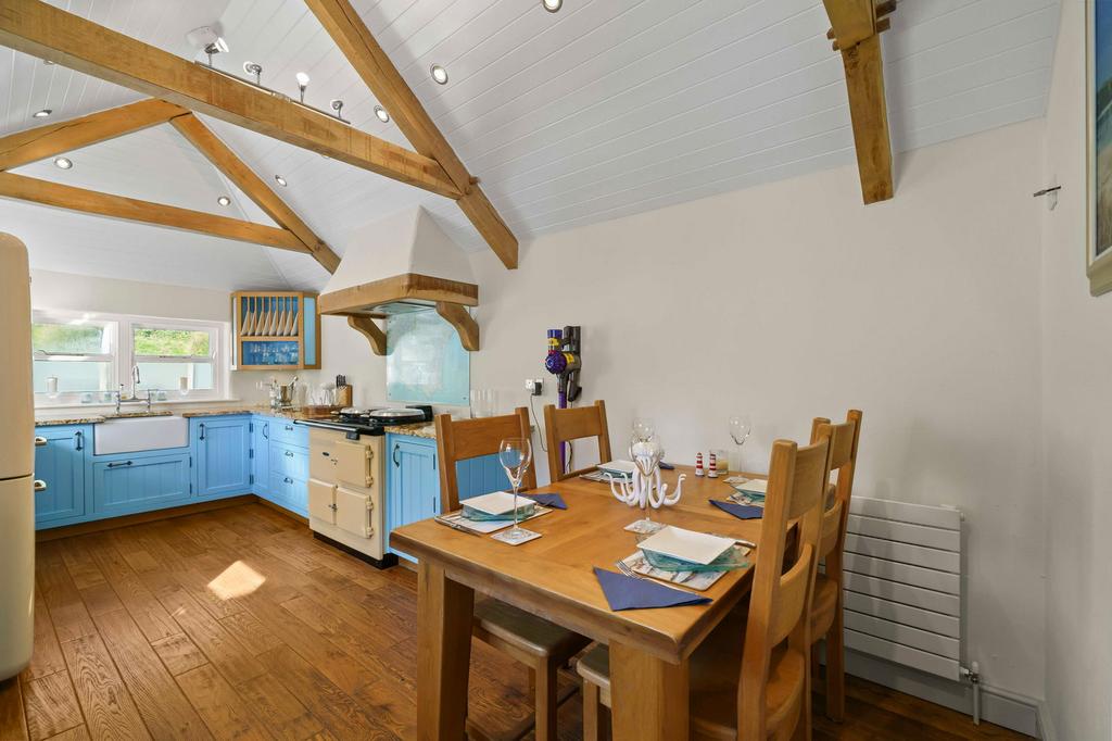 From here, you step into the kitchen/breakfast room, a bright and airy space with dual-aspect windows and a vaulted ceiling. The kitchen is thoughtfully equipped with an Aga, Belfast sink beneath the window, integrated dishwasher, and space for a fridge/freezer.