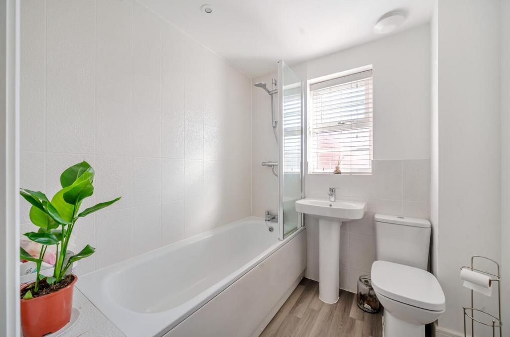 Bathroom - Bath with shower, low level WC, wash hand basin, partly tiled walls and karndean flooring.