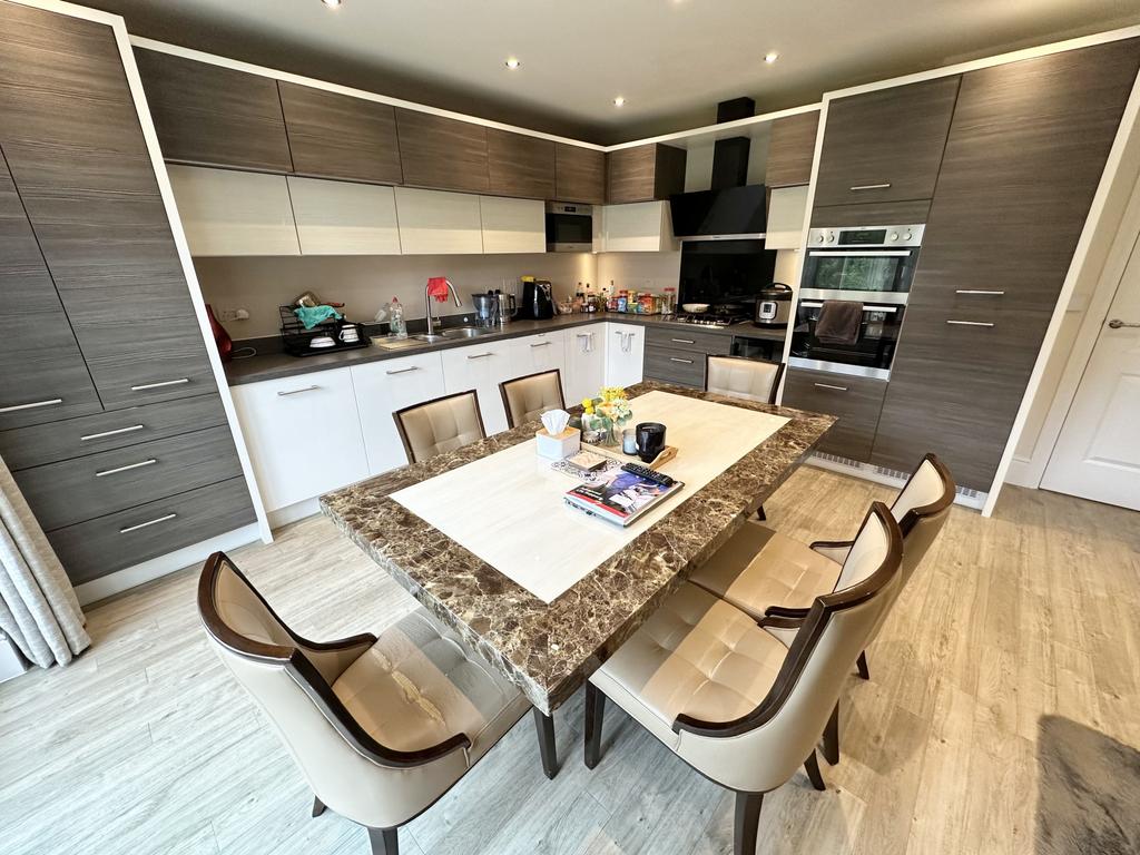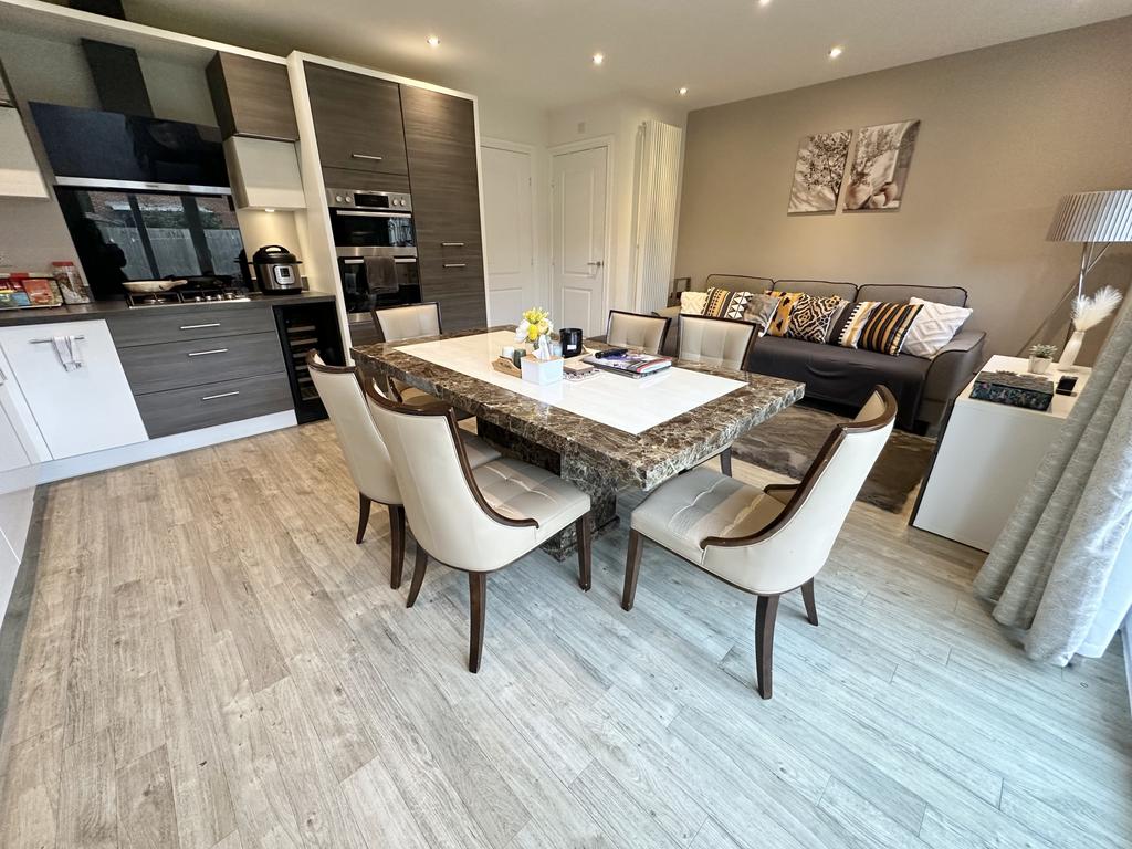 UPVC double glazed sliding doors and windows, a modern, professionally upgraded kitchen and appliances with a range of wall and base unit with complementary work surfaces, a range of integrated appliance including; oven and grill, hob with extractor fan over, dishwasher, wine fridge and fridge freezer. Stainless steel sink and drainer with mixer tap, storage cupboard housing washing machine and dryer and radiator.