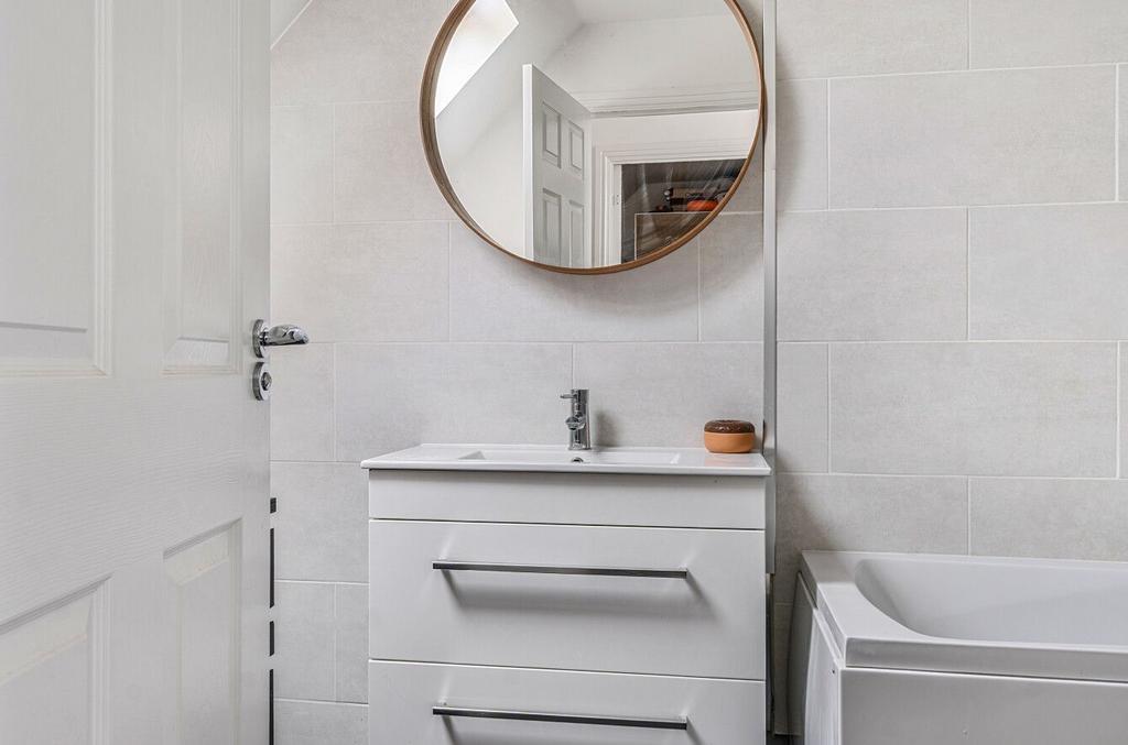 Upstairs, the principal bedroom benefits from a bay window and offers space for furnishings. This floor also features a spacious family bathroom complete with a bathtub and overhead shower.