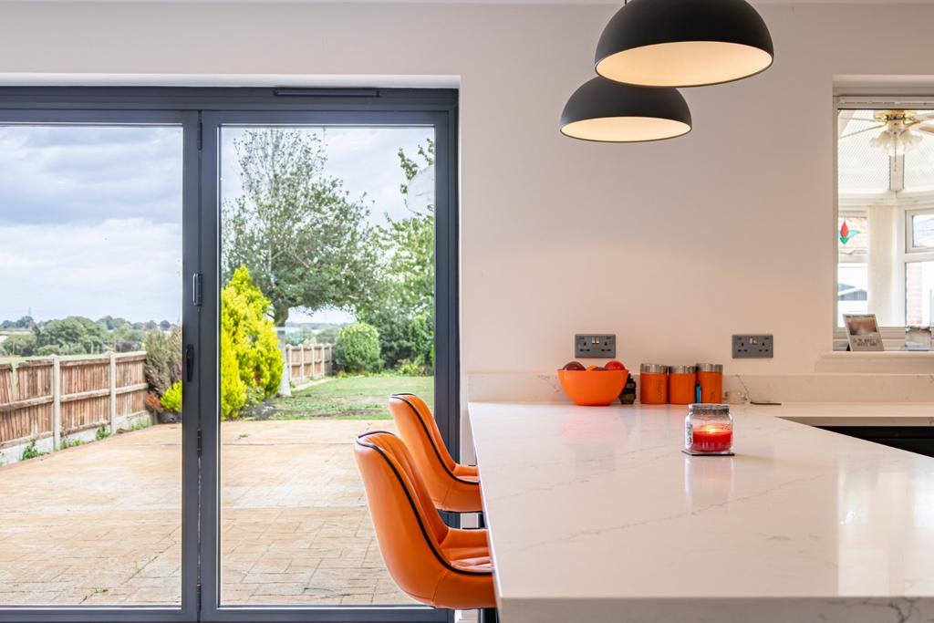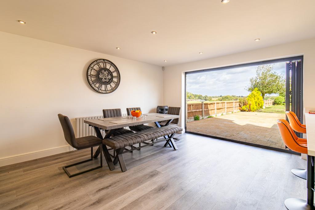 Upon entering the home, you're greeted by an entrance hall positioned in the centre of the property, with all principal reception rooms thoughtfully arranged around it. To the rear, the standout feature is the stunning open-plan kitchen/diner, a true hub of the home, ideal for modern family living and entertaining. The kitchen is beautifully appointed with contemporary storage units, sleek quartz worktops, a breakfast bar for casual dining, and a full range of integrated appliances, including an electric double oven, induction hob with extractor, dishwasher, fridge, wine cooler, and a premium Quooker boiling water tap. The generous dining area offers ample space for a large table and chairs and features bi-fold doors that open out onto the patio, creating a seamless flow between indoor and outdoor living. Adjacent to the dining area is the light-filled living room, enjoying a double aspect and boasting a stylish media wall with a modern flame-effect fireplace. At the front of the home, a second spacious reception room, also dual-aspect, is currently used as a games room, but also offers great flexibility for a playroom or snug. Complementing the kitchen is a practical utility room, providing extra storage and plumbing for laundry appliances. Additional ground floor features include a dedicated study, perfect for remote working, a cloakroom WC, and a bright conservatory with peaceful views over the garden and surrounding fields.