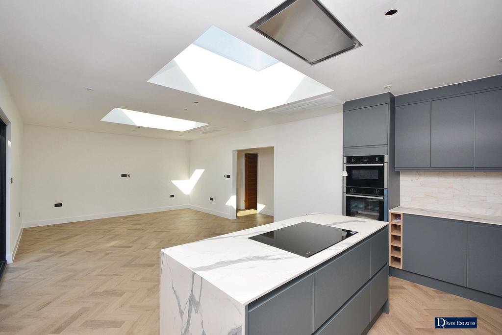 Bi-fold doors overlooking and leading to the rear garden. Two roof lights. Amtico flooring. Inset downlights. Inset sink unit with worktop surface and extensive range of base and eye level units with concealed lighting. Integrated Neff appliances including double oven, fridge freezer and dishwasher.