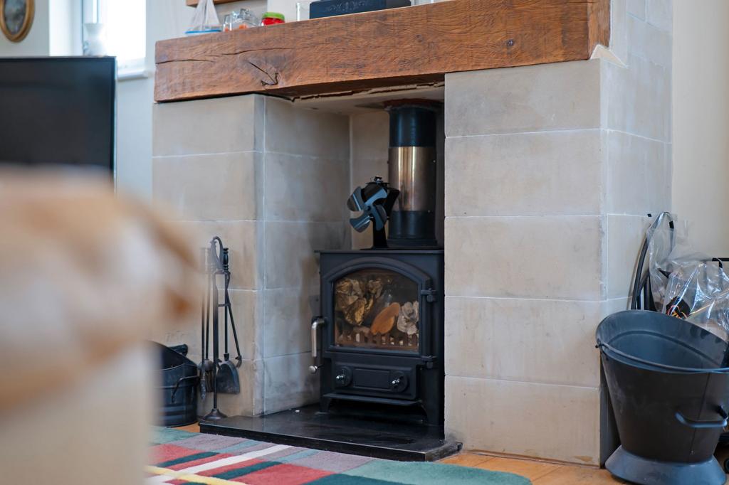 Vaulted ceiling with exposed king trusses, triple aspect room with uPVC double-glazed windows to the rear and side aspects, uPVC double glazed door to rear elevation and uPVC double glazed patio doors to side elevation, VELUX windows LED down lights, power points, wood-burning stove with a granite Hearth and oak lintel, satellite point, phone point, wooden flooring and open plan to kitchen.