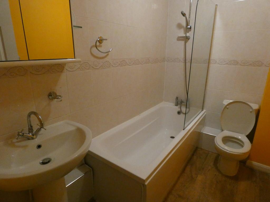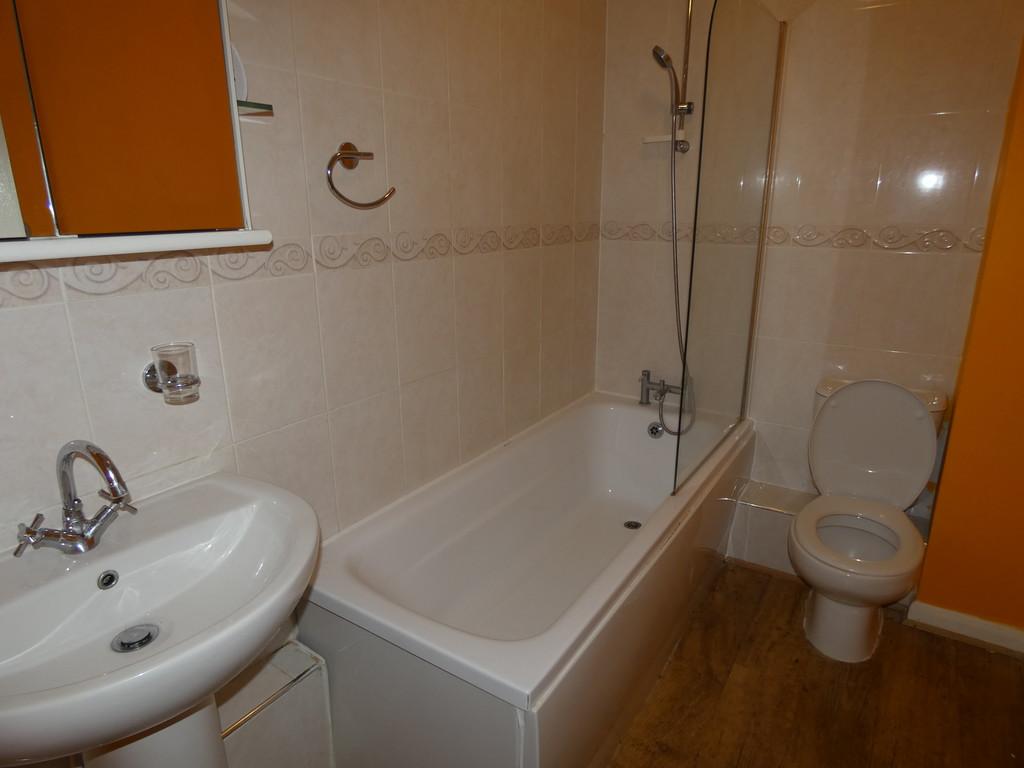 BATHROOM White suite comprising bath with shower over, pedestal wash hand basin with cabinet above and WC
