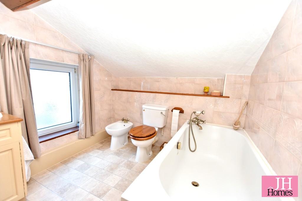 BATHROOM 10' 0" x 8' 0" (3.05m x 2.44m) Fitted with a four piece suite in white comprising of panelled bath with corner mounted mixer tap and shower attachment, WC, bidet and wash hand basin set to vanity unit with storage cupboard under. Built-in storage cupboard with shelved airing space and housing modern factory insulated hot water storage tank. Some reduced head height, exposed beam, radiator, low level uPVC double glazed tilt and turn window, tiling to walls and tile effect vinyl flooring.