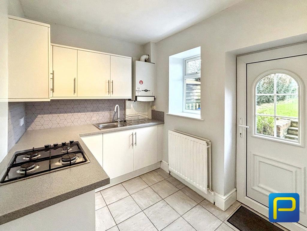 A modern fitted kitchen with sleek wall and base units, complemented by a stylish tiled splashback. The space benefits from a four-burner gas hob, and built in oven, stainless steel sink with drainer, and ample worktop space. There is also plumbing for a washing machine. Rear door leading to the garden.