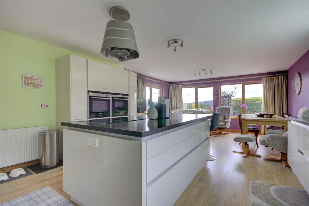 A modern handleless fitted kitchen in white gloss with laminate worktop and splashback. Base units include several with deep drawers and larder units. Integrated appliances incorporated into this well designed kitchen include an eye level oven and combi oven, a larder fridge and freezer side by side and dishwasher beside the sink. A versatile warming drawer is located underneath the combi oven with slow cooker feature. The kitchen island boasts an induction hob with feature chrome hood above, deep drawers and seating area. There is laminate flooring running from the kitchen to the dining area where there are two large windows and a French door leading out to the patio area, perfect for al fresco dining surrounded by glorious scenery. A door leads through to the utility and rear access.