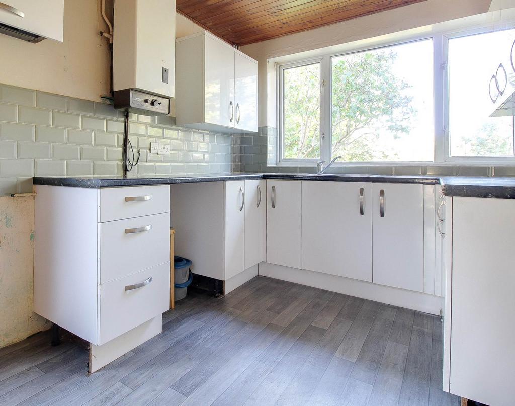 15'3 x 8'3. Fitted white kitchen with uPVC double glazed door to garden. Stainless steel sink unit with mixer tap, cupboards under and over. Potterton Flamingo gas fired boiler. Tiled splashback. Space for dishwasher and cooker. Oak dresser with cupboards and drawers under, shelves over. Radiator. Pine ceiling.