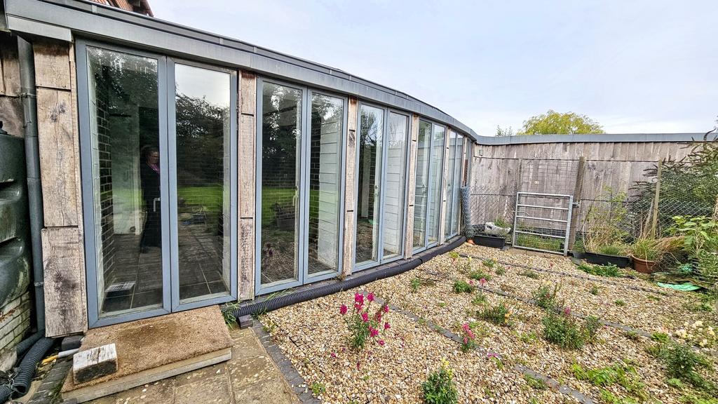 GARDEN ROOM (6.3m x 2.9m approx)(20'6" x 9'5" approx) designed with heat sink properties, with slate tiled floor, five opening glazed doors with side windows leading to the garden. Ceiling spot lights, and passageway with recessed wall cupboards leading to the large double garage.