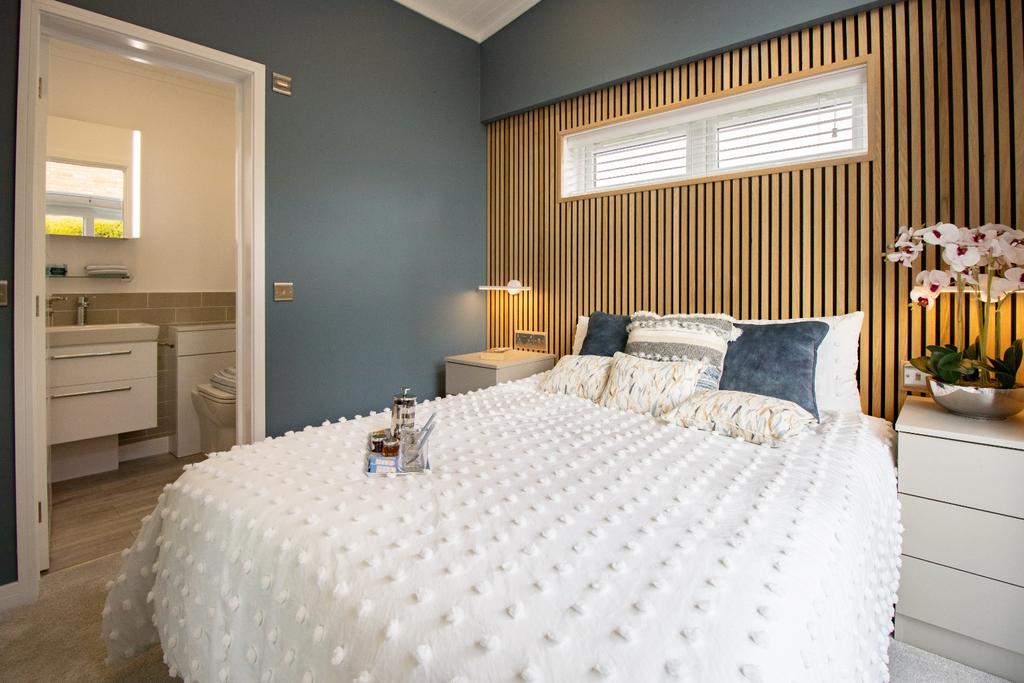 Bedroom 1 is accessed via the entrance hall and enjoys the luxury of an en-suite shower room and fitted wardrobe, with a sliding door to the patio. Bedroom 2 mirrors this, with a fitted wardrobe, door to the patio, and an en-suite with a bath and shower over.