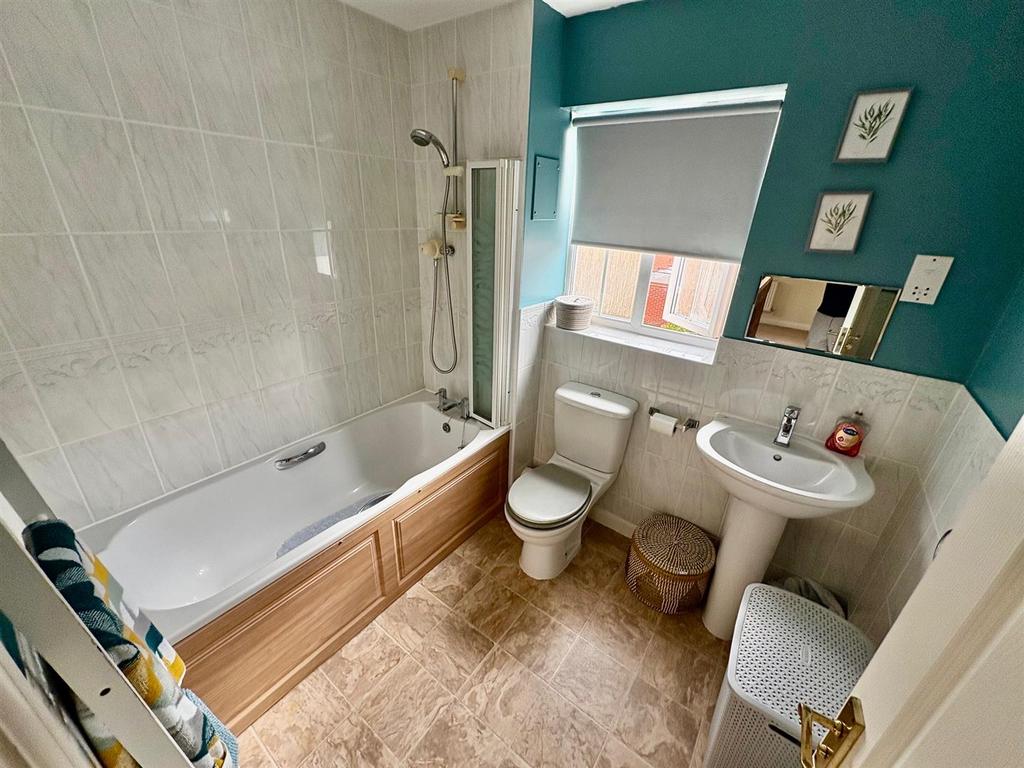 Bathroom Fitted with three piece suite comprising panelled bath with shower over, pedestal wash hand basin and low-level WC, window to front, radiator, vinyl flooring, door to:
