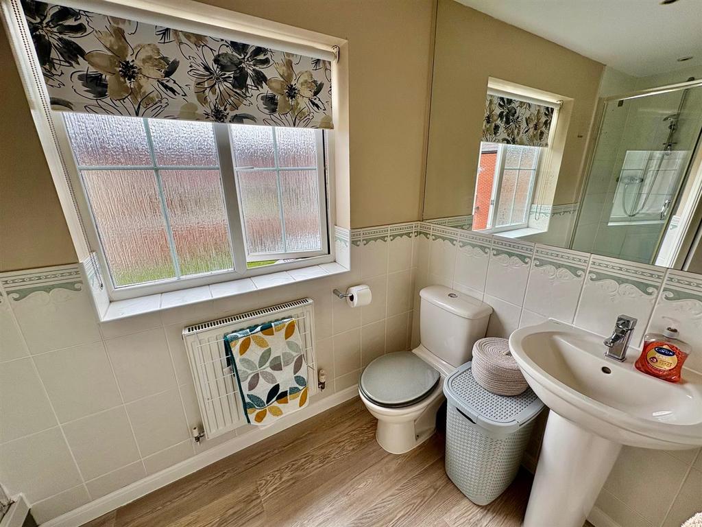En-suite Fitted with three piece suite comprising pedestal wash hand basin, tiled shower cubicle and low-level WC, tiled surround, window to front, radiator.