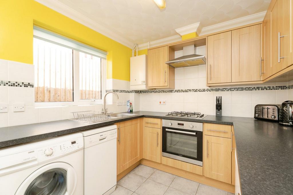 Kitchen - A beautifully presented kitchen fitted with a range of wall and base units with complimenting worktops, with a side aspect double glazed window, tiled flooring, and tiled splashbacks, integrated appliances including a gas countertop stove, extractor hood and oven, further space and plumbing for additional appliances, an inset sink with a mixer tap and drainer, and a door providing access to the side/rear.
