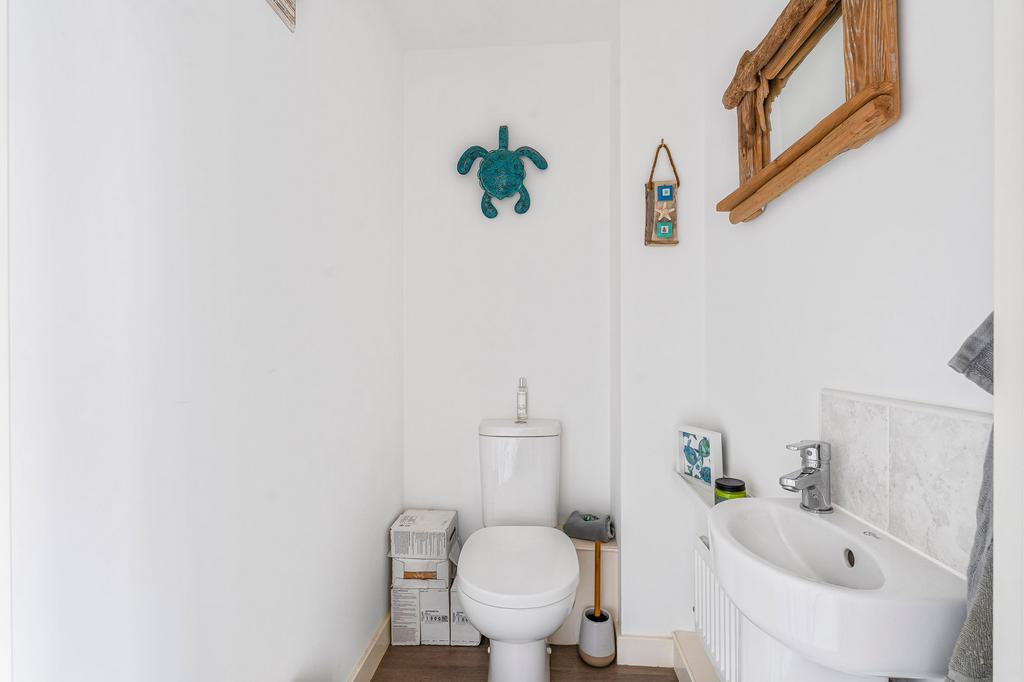 Adjoining the living room is a ground-floor cloakroom/WC and stairs to the first floor.