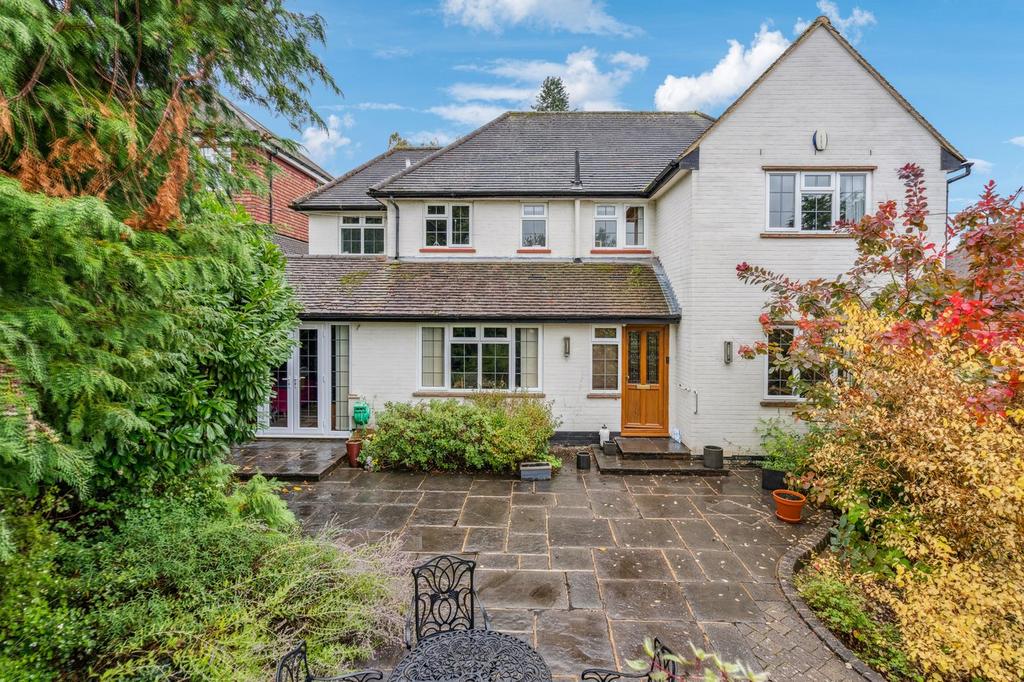 To the rear, the property features a good-sized private garden with a generous patio area, ideal for entertaining, outdoor dining, or family play space — all set within a peaceful and leafy setting.