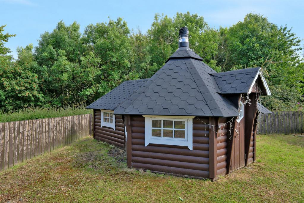 Adding to the appeal is a purpose-built UPVC cabin of approximately 40 square metres, currently divided into a large gym and office. Fully equipped with power, internet, lighting, water, and its own kitchen and toilet facilities, it’s perfect for running a business or working from home. Outside, a covered hot tub is included in the sale, and the expansive garden to the front of the cabin is laid to lawn, featuring a summer house and BBQ hut—ideal for entertaining guests or relaxing with family. A detached double garage provides ample parking and storage.