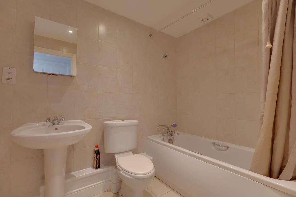 Fitted three piece suite comprising; panelled bath, low level w.c. and pedestal wash hand basin. Tiled wall surfaces. Tiled flooring. Smooth plastered ceiling with spotlights. Extractor fan. Radiator.