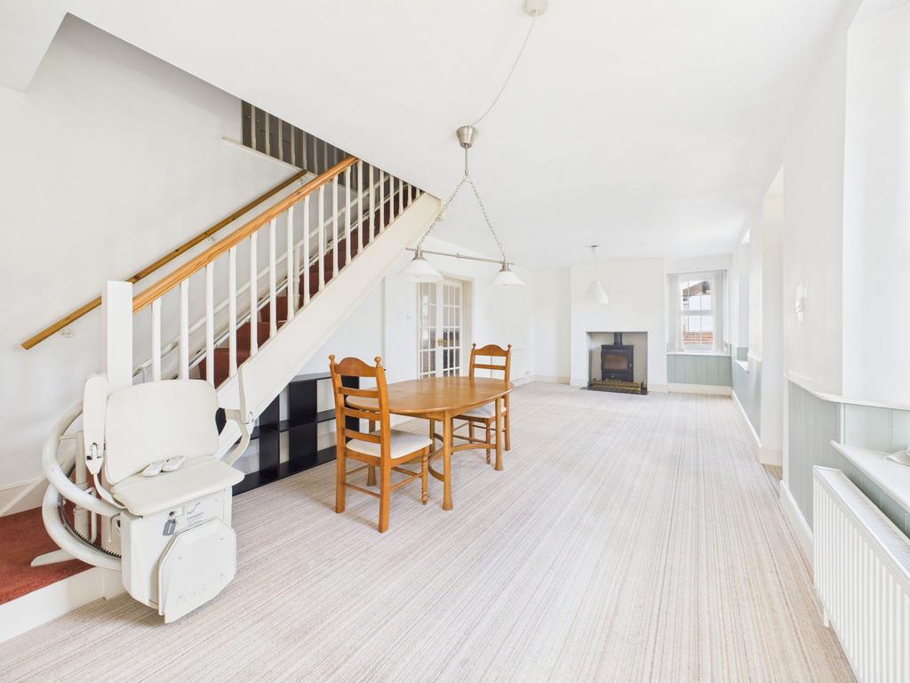 Stepping inside, you’re welcomed into a wonderfully bright and airy open-plan living and dining space that stretches the full depth of the home. Two generous front-facing windows flood the room with natural light, complemented by an additional side aspect window that adds even more brightness and gives a pleasant view of the greenery outside. The soft neutral décor and half-height painted panelling bring a subtle touch of character, while the pale striped carpet enhances the sense of space and warmth. At the far end of the room, there’s a cosy focal point fireplace, currently fitted with a wood-burning stove, perfect for creating a homely atmosphere on cooler evenings. The open layout makes this an incredibly versatile space; there’s ample room to arrange both a comfortable seating area and a large family dining table, ideal for entertaining or simply enjoying day-to-day family life. To one side, the staircase to the first floor rises neatly. A glazed door at the rear leads into the next area of the home and helps channel even more light through the space.