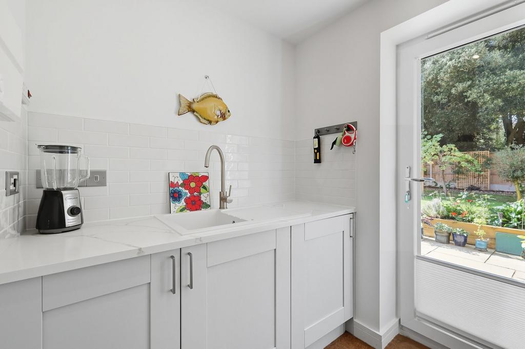1.94m x 1.75m (6' 4" x 5' 9") Range of matching base unis with worktop over, sink, integrated washer/dryer, door to understairs storage cupboard and external door to rear garden.