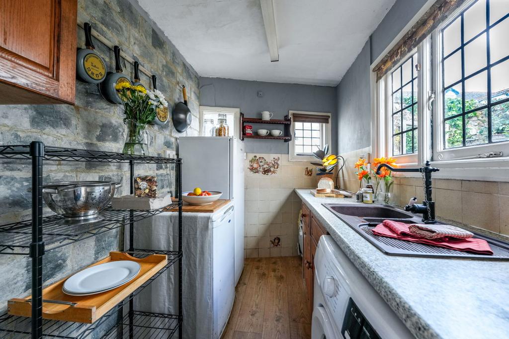 The cottage is entered via a courtyard and traditional stable door leading to the hallway. The galley kitchen offers fitted units, integrated oven and hob, and space for appliances. From here, the house opens into a larger kitchen/dining room, featuring a Countrychef range cooker and a partial exposed painted stone wall, with space for a dining table. A sliding door leads through to the lounge—a generous and atmospheric reception room with flagstone flooring, exposed stone, and a large open fireplace. A ground floor bathroom with shower and WC completes this level.