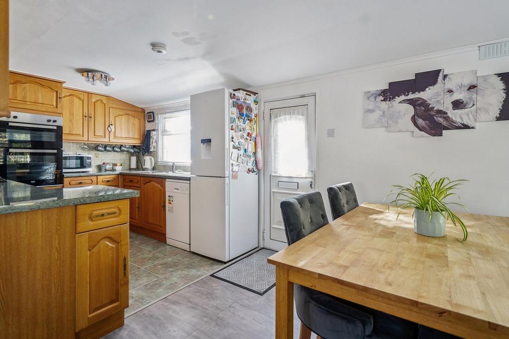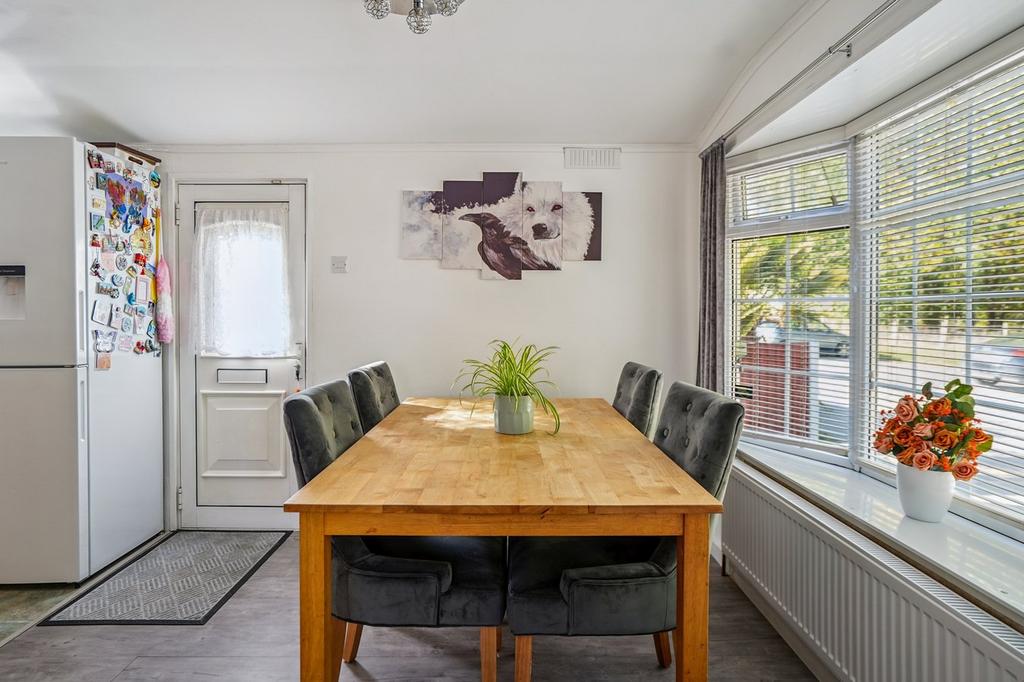 Internally, the home features a bright and welcoming entrance hallway leading to a spacious living room, where a large picture window fills the space with natural light. This room flows effortlessly into the dining area and then into a modern kitchen fitted with ample eye-level and base units.