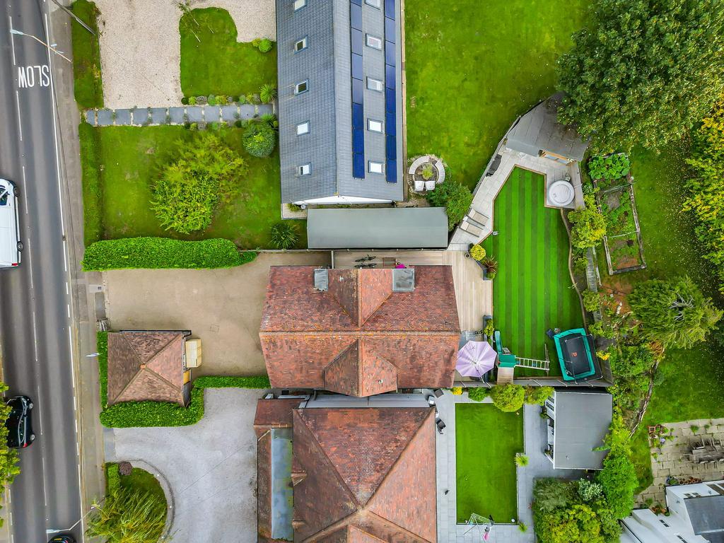 To the front of the property, a detached timber-framed garage has been thoughtfully converted by the current owners into a fully equipped home gym, offering a fantastic space for fitness or hobby use. A large private driveway provides ample off-street parking.