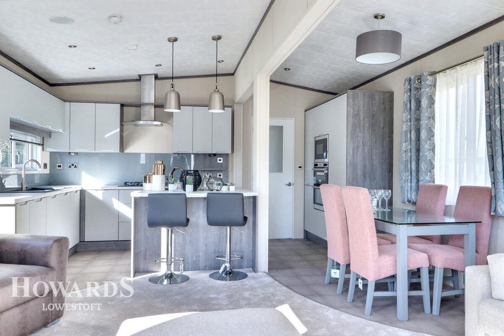 Kitchen Area: Full range of modern wall and base units all set around extended worksurfaces with integrated appliances including dishwasher, fridge, freezer, 4 ring hob, extractor, oven, microwave, and wine cooler, central island and breakfast bar, vinyl floor, vaulted ceiling, sealed unit double glazed window.