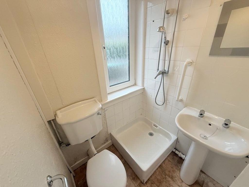 Shower cubicle with mains shower, wash hand basin, low level wc. Frost DG window.