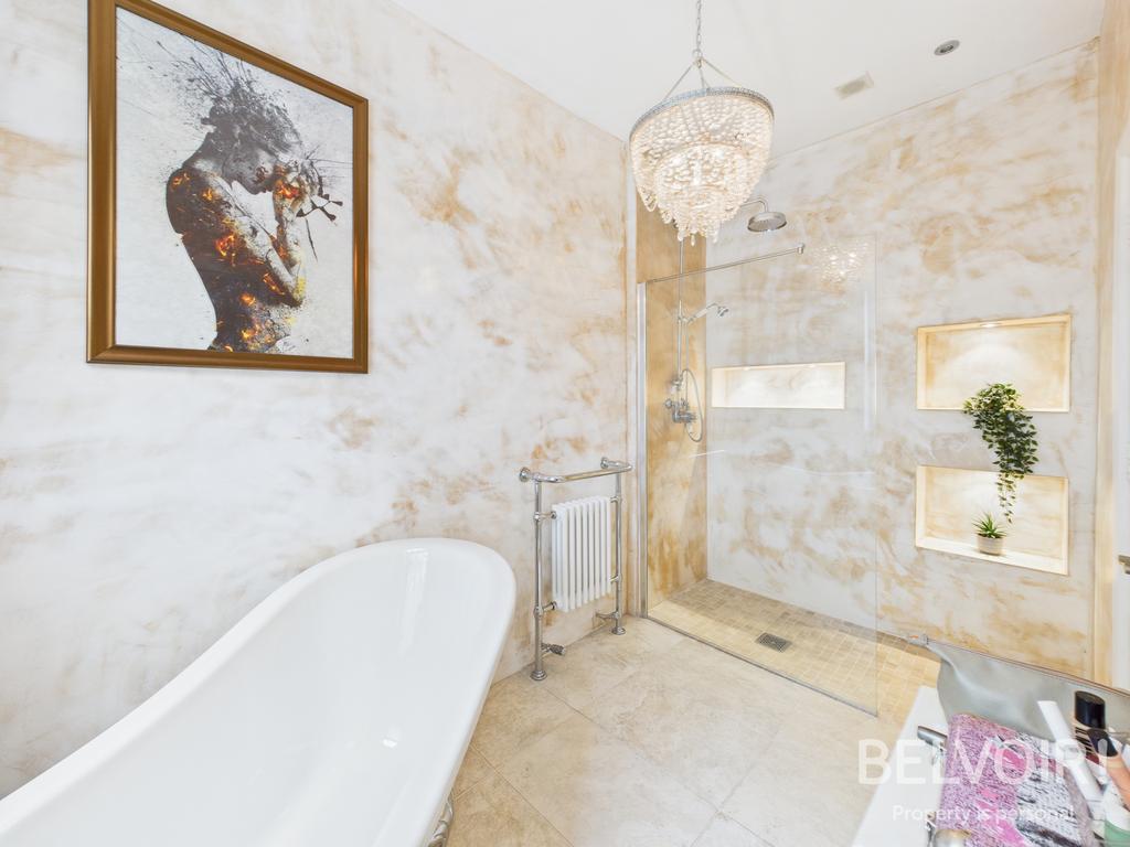The first floor benefits from a galleried landing with access to a family bathroom boasting a four piece suite and log burner. There are a further four bedrooms all with original fireplaces and two with stunning en-suite shower/bathrooms. The master bedroom is larger than most with dual aspect windows. The impressive en-suite to this room certainly has the wow factor with feature roll top bath, double walk in shower and polished plastered walls.