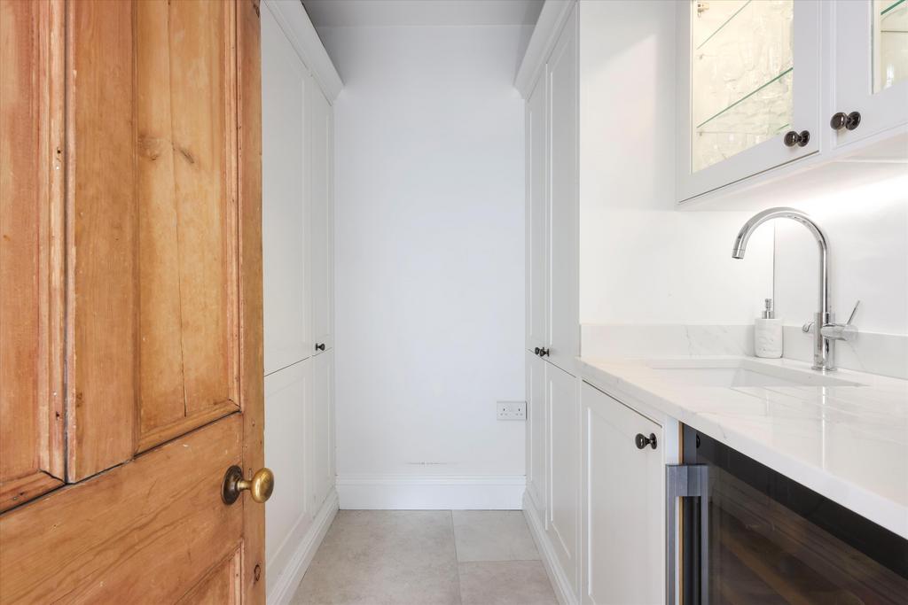 To the rear of the property lies an impressive open-plan kitchen and family room. This beautifully designed space features a bespoke modern kitchen with a mix of floor and wall-mounted units, built in appliances including a coffee machine plus a Quooker hot tap. The kitchen flows seamlessly into a dining area and a cosy sitting space complete with a log-burning stove. A generous sized glass door opens out to the private rear garden, creating a perfect environment for indoor-outdoor living. Adjacent to the kitchen is a practical utility room offering additional storage, a built in drinks fridge, a filtered, carbonated water tap and has provision for 2 washing machines and a tumble dryer. A guest cloakroom completes the ground floor.