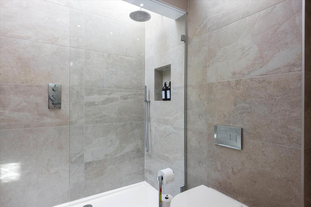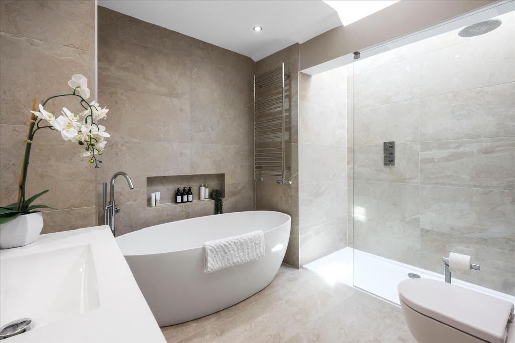 Upstairs, there are five bedrooms in total. Two enjoy the benefit of modern en suite shower rooms, while the remaining three share a luxury contemporary family bathroom which benefits from under floor heating. The fifth bedroom, currently used as a study, offers potential to be incorporated into the Principal suite, creating a luxurious walk-in wardrobe if desired.