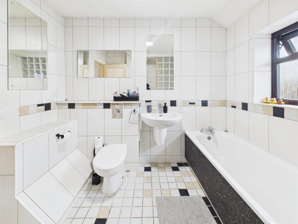 Bathroom - Suite comprising panelled bath with mixer tap over, step in shower with shower off the mains over, low level wc, wall mounted wash hand basin with mixer tap over. Fully tiled walls, heated towel rail, door to airing cupboard, tiled flooring paired with underfloor heating, front aspect upvc double glazed window.