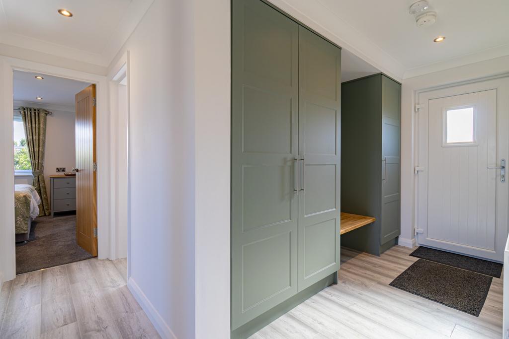 Currently the show home for the development, this stunning lodge features a bright and spacious open-plan living area, enhanced by floor-to-ceiling windows and French doors that seamlessly blend indoor and outdoor living. The generous layout easily accommodates both lounge and dining areas, creating a warm, versatile hub ideal for relaxing or entertaining. The beautiful contemporary kitchen is equipped with stylish cabinetry, quality worktops, and a full suite of integrated appliances, including an electric double oven, microwave, hob with extractor, separate fridge and freezer, and dishwasher. A separate utility room adds convenience with extra storage and housing for the washing machine.