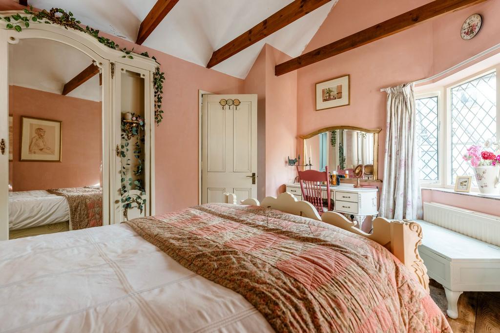 - Upstairs, there are two comfortable bedrooms with views over the village and gardens, including a principal bedroom with dual aspects, exposed beams, and a fitted wardrobe