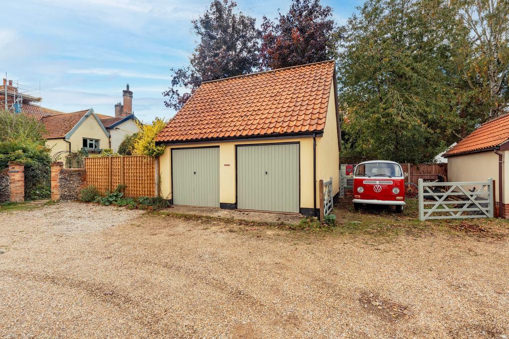 - The double garage offers potential for conversion into a home office, studio, or annex, with a covered seating area alongside and a shared close with private off-road parking