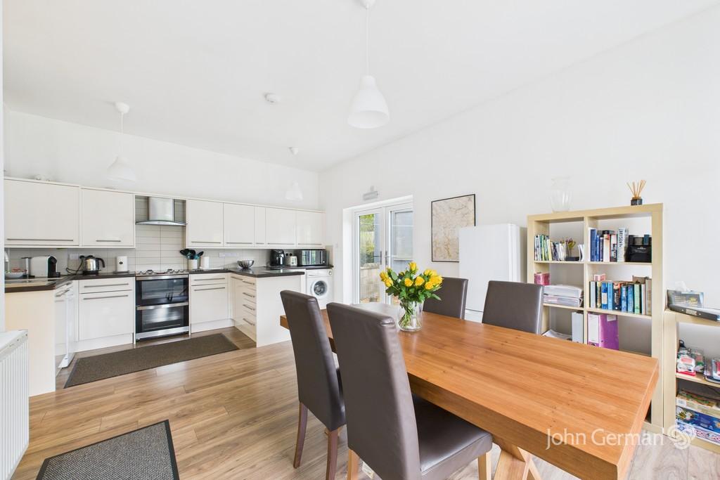 Accessed via a composite entrance door, the property opens into a dual-aspect dining kitchen with windows to the front and French doors opening to the side garden. The kitchen is fitted with rolled edge work surfaces, an inset 1 ½ stainless steel sink with drainer and chrome mixer tap, and tiled splashbacks. There is a range of base cupboards and drawers with an electric oven with induction hob and extractor above, dishwasher, undercounter fridge, plus additional freestanding fridge/freezer. A peninsula work surface provides additional preparation space with an adjacent washing machine, with complementary wall-mounted cupboards above for further storage.