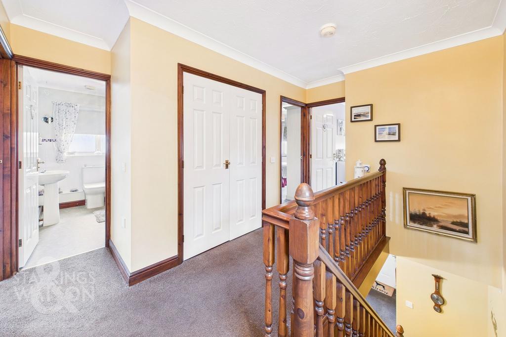 From the first floor landing all four bedrooms can be found as well as the generous double airing cupboard and three piece family bathroom suite complete with a part tiled surround and low level wall mounted radiator. The main bedroom sits towards the right hand side of the property, a well proportioned double room with large uPVC double glazed windows. This space currently houses built in wardrobes with the added benefit of an en-suite shower room complete with low level radiator and frosted glass window. The other well proportioned double room sits on the adjacent side of the home overlooking the rear gardens and again laid with carpeted flooring and built in wardrobes leaving more than enough space for a double bed. The two smaller rooms within the property again could accommodate double beds and both are laid with carpeted flooring with one sharing a front facing aspect and the other to the rear.