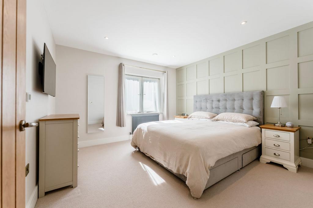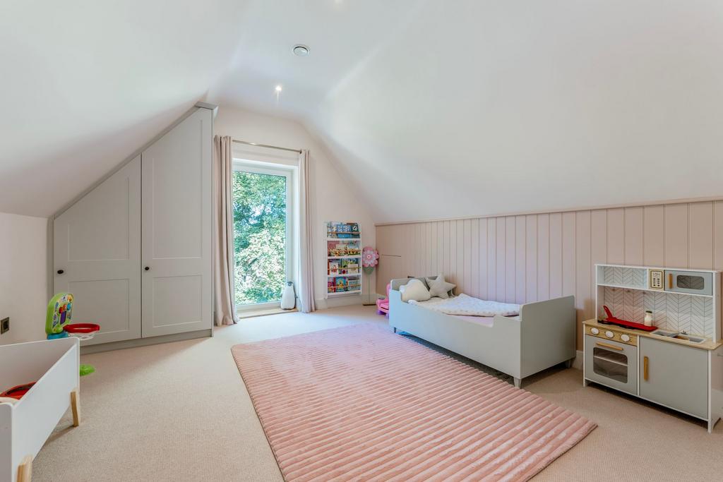 The second floor offers two generously proportioned double bedrooms with built-in storage, one of which boasts a Juliet balcony overlooking woodland to the rear. A beautifully appointed family bathroom completes the level, providing a serene retreat for family and guests alike.