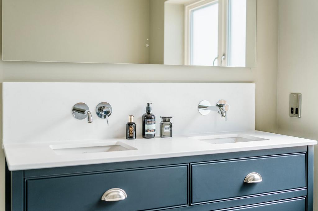 - Principal suite with walk in dressing room and a designer en suite featuring navy sanitaryware dual basins and a walk in shower