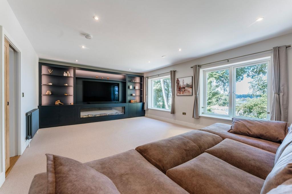 A versatile snug showcases a bespoke media wall, echoed in the refined first-floor living room, creating an atmosphere designed for supreme comfort and an exceptional entertainment experience.