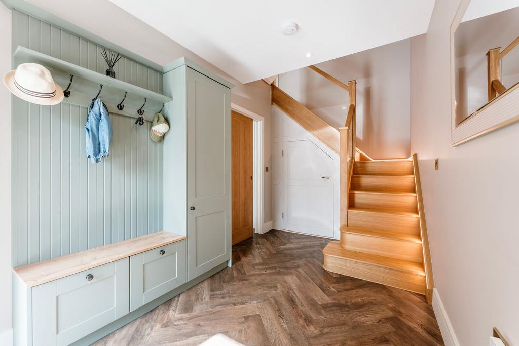 The entrance hall exudes refined practicality, featuring bespoke storage solutions, including tailored cupboards and hooks for outerwear, seamlessly blending style with everyday functionality.