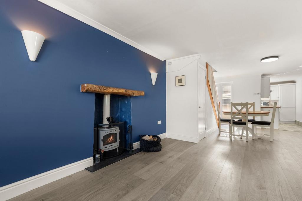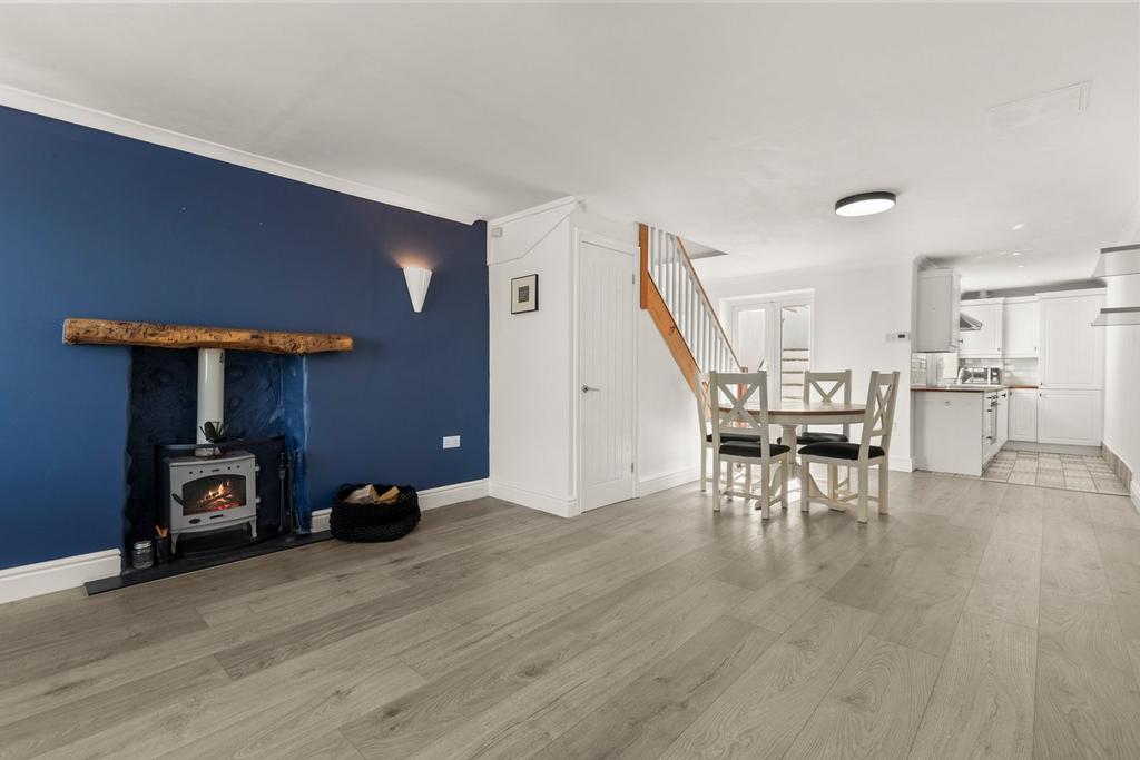 - Spacious open-plan living, dining, and kitchen area with wood-burning stove.