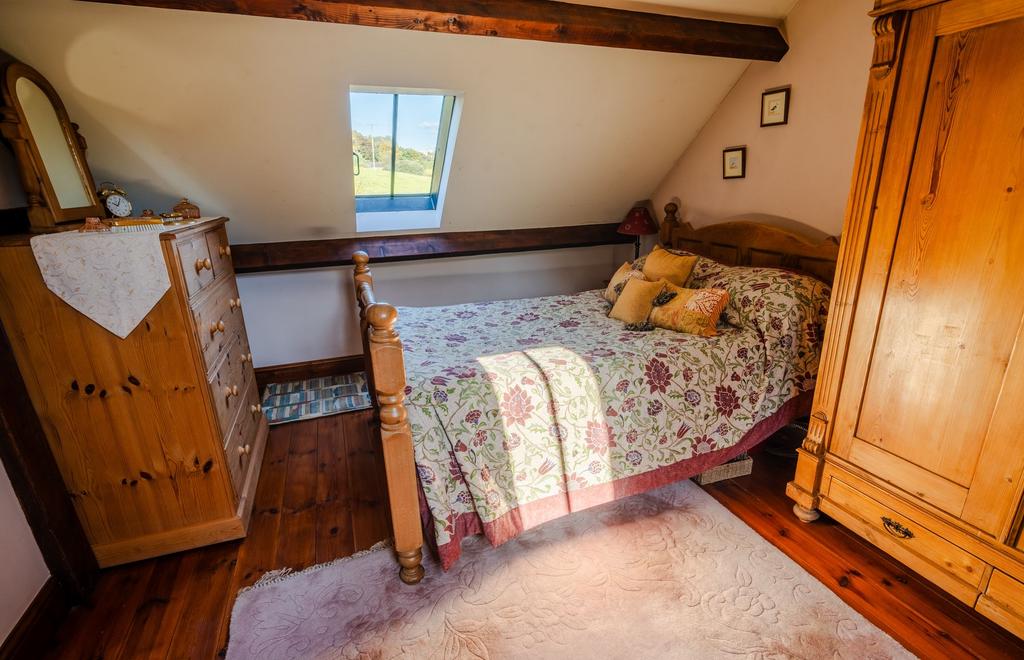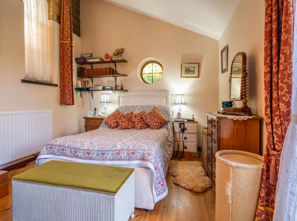 A spacious dual-aspect bedroom featuring double doors that open directly onto the garden, allowing plenty of natural light, and a charming porthole window to the rear.